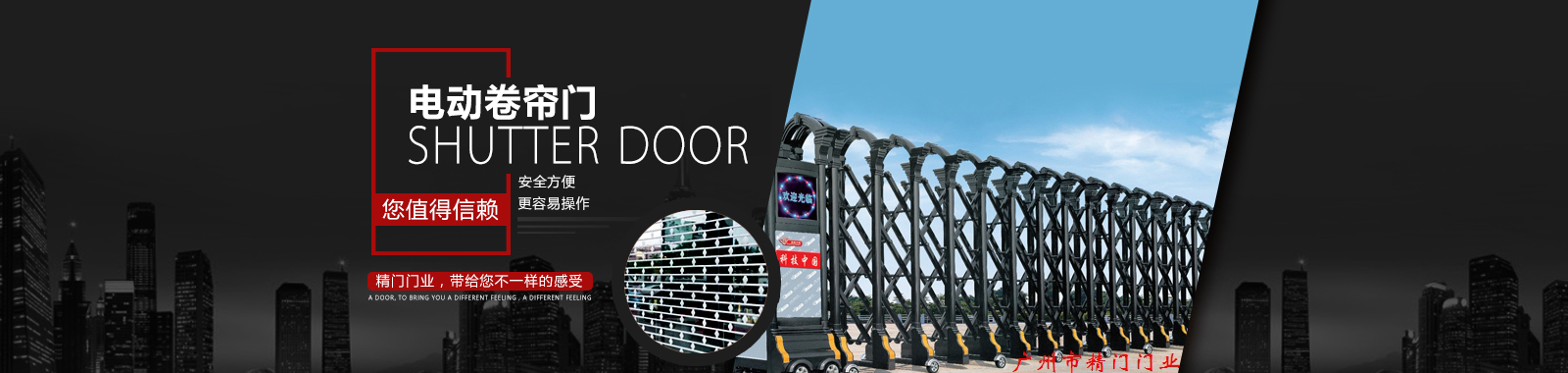 廣州市精門門業(yè)有限公司是一家集研發(fā)、生產、銷售、安裝、服務為一體專業(yè)從事防火卷簾門、電動卷閘門、抗風卷簾門、水晶卷閘門、伸縮門、不銹鋼通花閘、澳式靜音卷簾門、歐式卷閘門、防爆卷閘、車庫門、工業(yè)推拉門、鋁合金卷閘門、鋁合金卷簾門窗、不銹鋼電房門、快速卷簾門、綜合性、專業(yè)性機構。數年來,精門門業(yè)一直專注于技術創(chuàng)新,并引進歐美先進技術,通過不斷完善與進取,始終如一為客戶提供高品質的產品和服務。